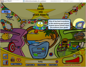 My Reward Boardのタスク設定は、ボードのイラストの中にある、「the Can Do Calender」のタスク欄に書いていきます。カレンダーのタスク欄には、すでに勉強や手伝い、掃除などいくつかの分野からさらに詳細な項目が選べるようになっていますが、新しい項目を加えることもできます。カレンダーの日にちとタスクがぶつかるマス目に旗のアイコンが立っています。子どもたちがその日の目標を達成したら、旗のアイコンをクリックします。すると、My Reward Boardのキャラクターの顔に変わるので、その日のタスクをできたかどうかがわかります。また、達成できるたびにポイントが加算されていきます。